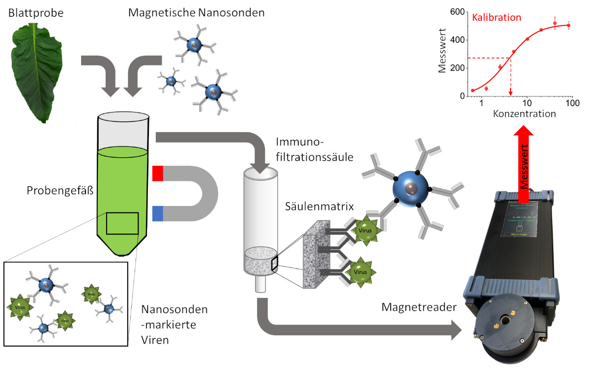 Im Projekt „Nanosonden-gestütztes Screeningverfahren zur Pflanzenpathogen Detektion (NanoSPoD)“ steht ein viraler Quarantäneschaderreger, das Jordanvirus, im Fokus, der zu großen Ernteverlusten bei Tomaten- und Paprikapflanzen führt. Um die Verbreitung bei Pflanzen zu begrenzen, soll u.a. für Kontrollbehörden wie den Landwirtschaftskammern ein schnelles, mobiles Testsystem für Krankheitserreger entwickelt werden. Der Verbund hat hierfür ein Verfahren entwickelt, durch das verschiedene Pflanzenviren spezifisch durch Antikörper-gekoppelte magnetische Nanosonden markiert und die Virusmenge mit einem mobilen Handgerät über das magnetische Messsignal bestimmt werden können. Nach einer kurzen Probenvorbereitung können vor-Ort-Analysen zur Bestimmung des Schaderregers innerhalb weniger Minuten durchgeführt werden, was einen großen zeitlichen Vorteil gegenüber der herkömmlichen Labordiagnostik bedeutet. Durch die Weiterentwicklung des Messgeräts soll zukünftig auch die Messung mehrerer Krankheitserreger in einer Probe möglich gemacht werden. Das Konsortium besteht aus dem Fraunhofer-Institut für Molekularbiologie und Angewandte Oekologie, der GeneCon International GmbH, dem Forschungszentrum Jülich und der Computomics GmbH.