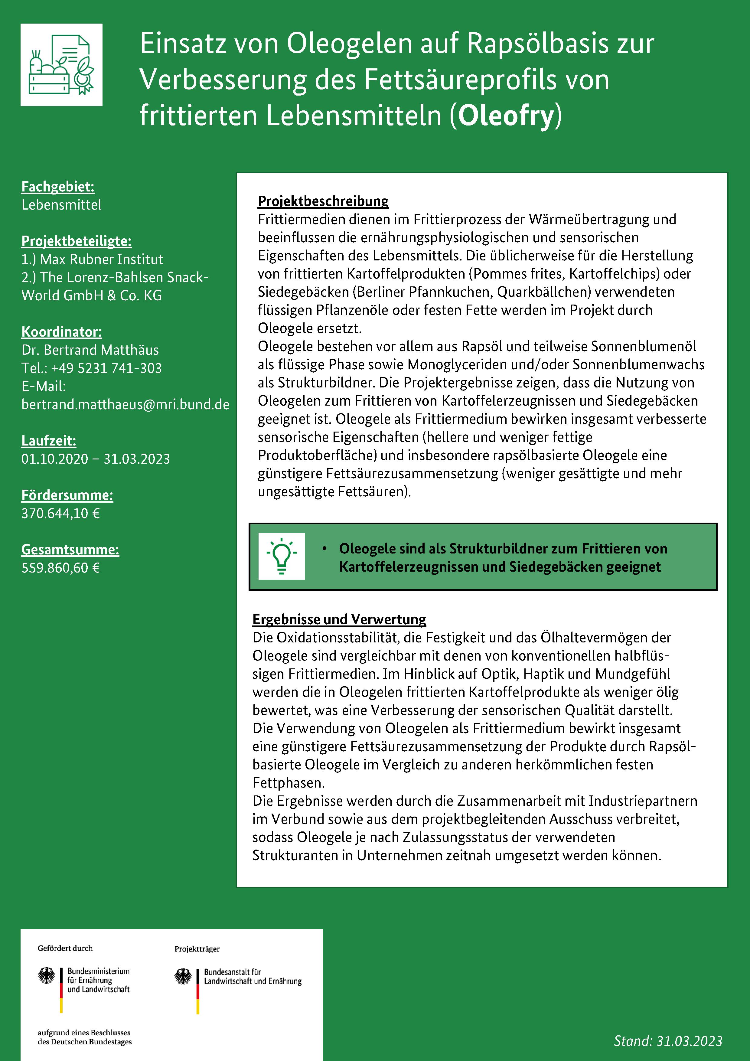 Einsatz von Oleogelen auf Rapsölbasis zur Verbesserung des Fettsäureprofils von frittierten Lebensmitteln